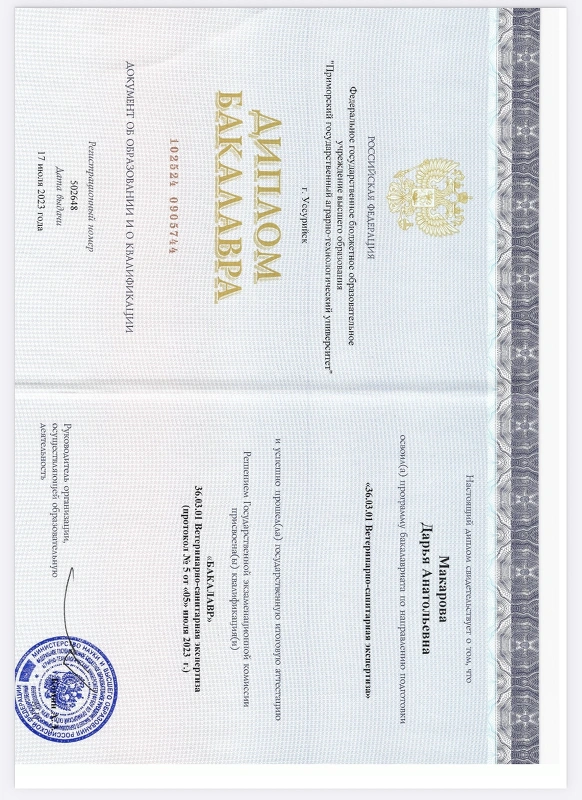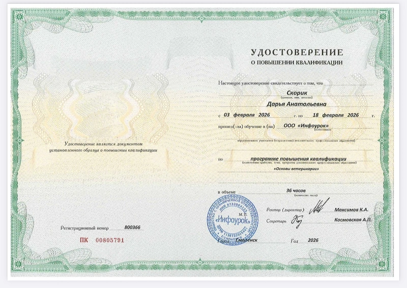Имею среднее ветеринарное образование по специальности «Ветеринарный фельдшер» и высшее — по специальности «Ветеринарно‑санитарный эксперт». Недавно прошла повышение квалификации по программе «Основы ветеринарии».